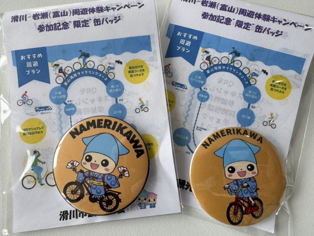 レンタサイクルを利用された方には、貸出時または返却時に、キャンペーン参加記念品を滑川市観光協会受付で進呈します。※限定キラリン缶バッジ、2種類のデザインからおすきなデザインをお一つプレゼント。